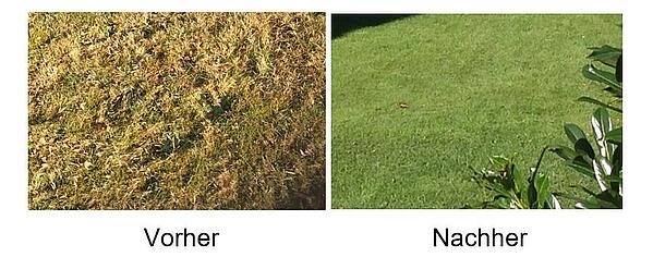Durch Vertikutieren, Düngern und Nachsähen wird ein schöner Rasen erzeugt.